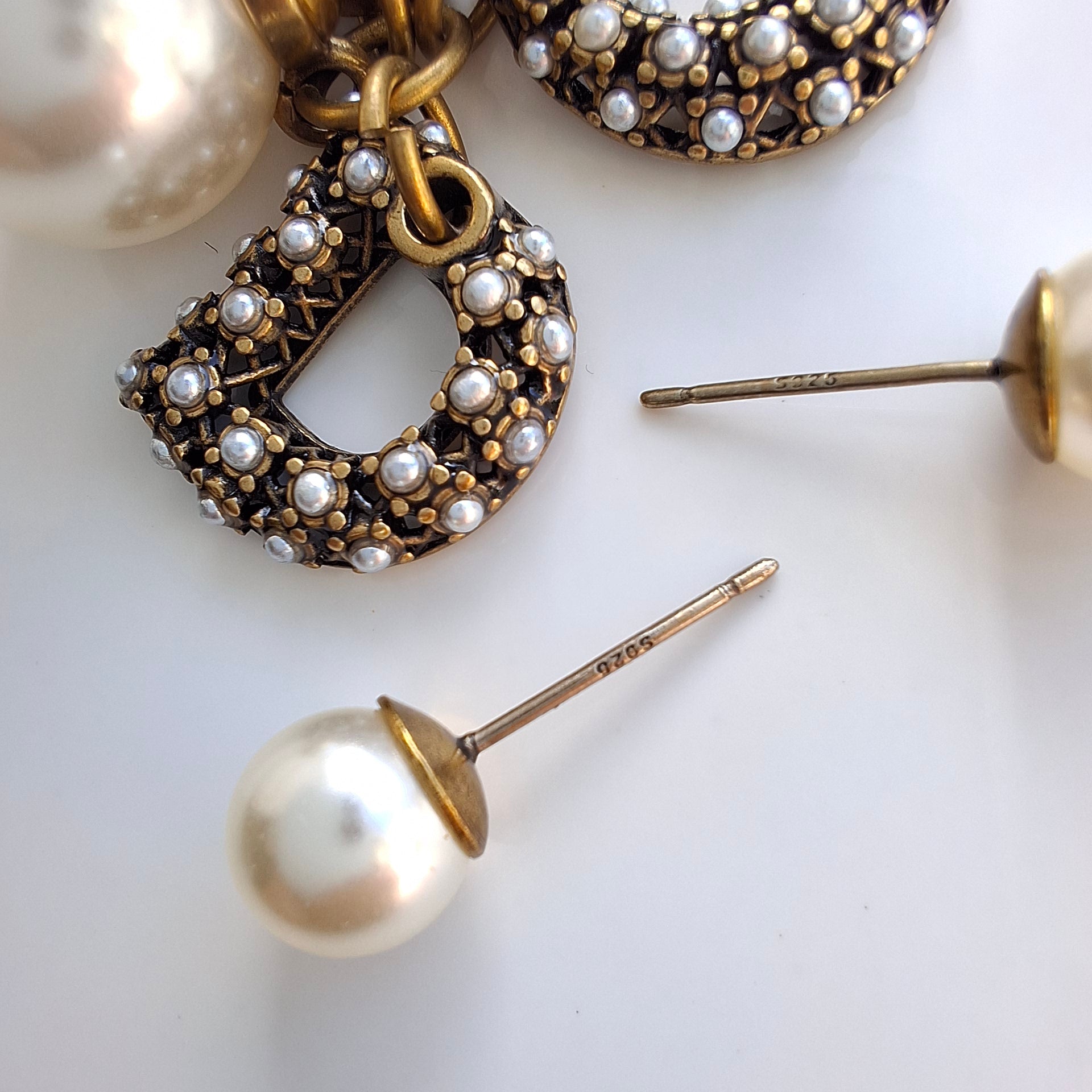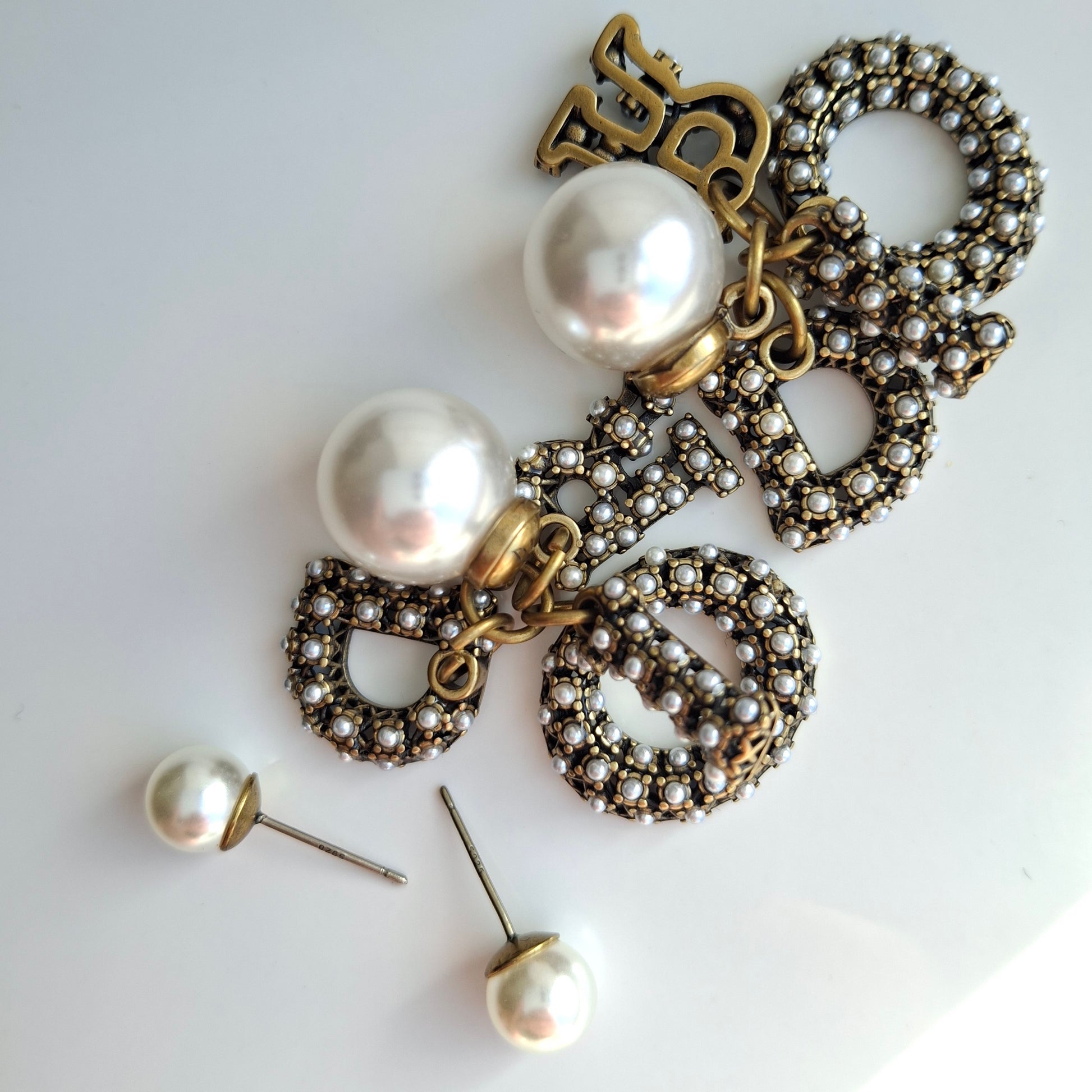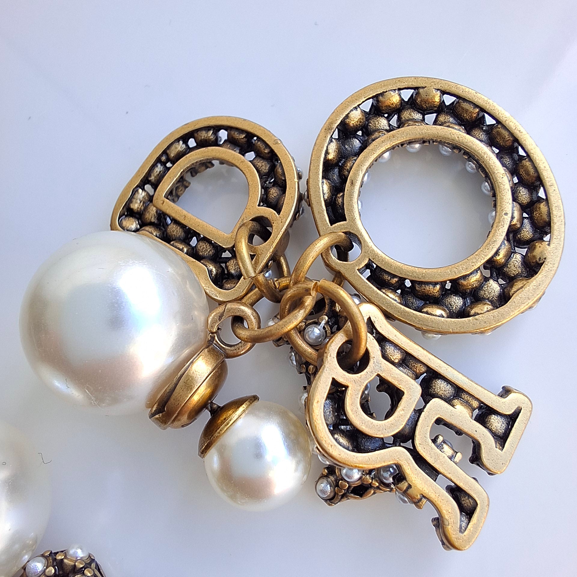 Dior Tribales DIOR logo earrings in white pearlescent with gold and faux pearl DIOR logo drops. With original packaging, excellent condition.