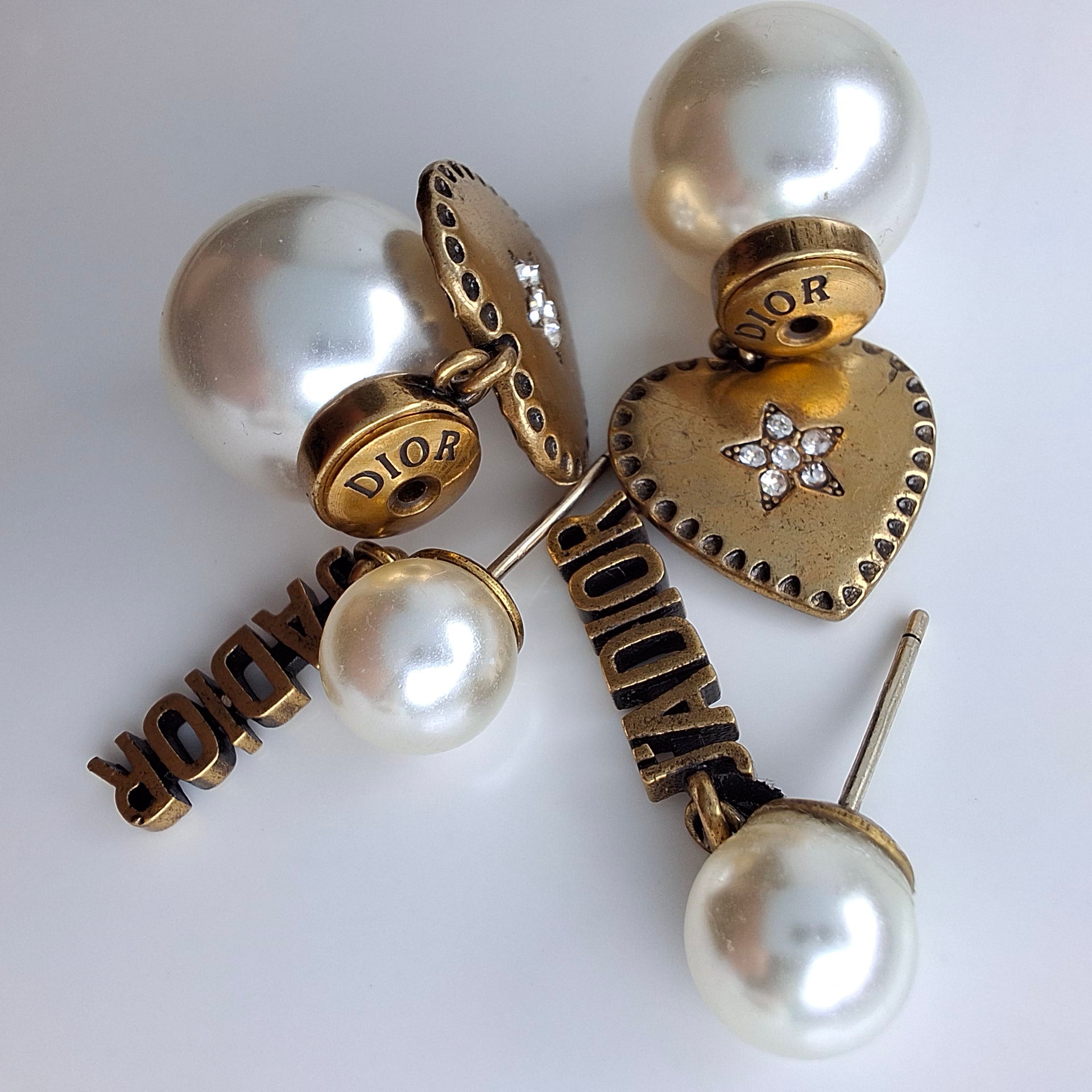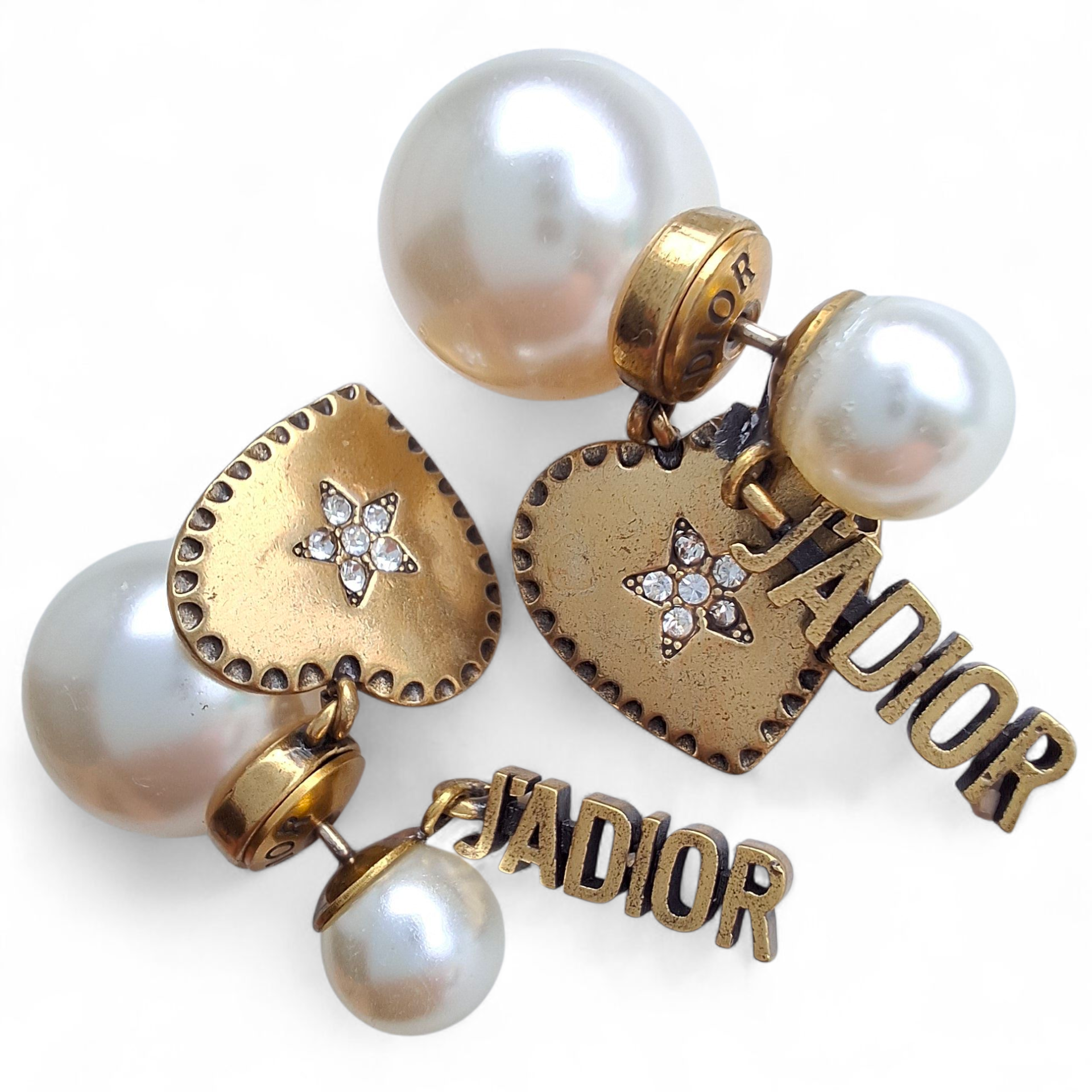 Dior Trbales J'ADIOR statement earrings in white resin with antique gold finish heart and logo. With original packaging, excellent condition.
