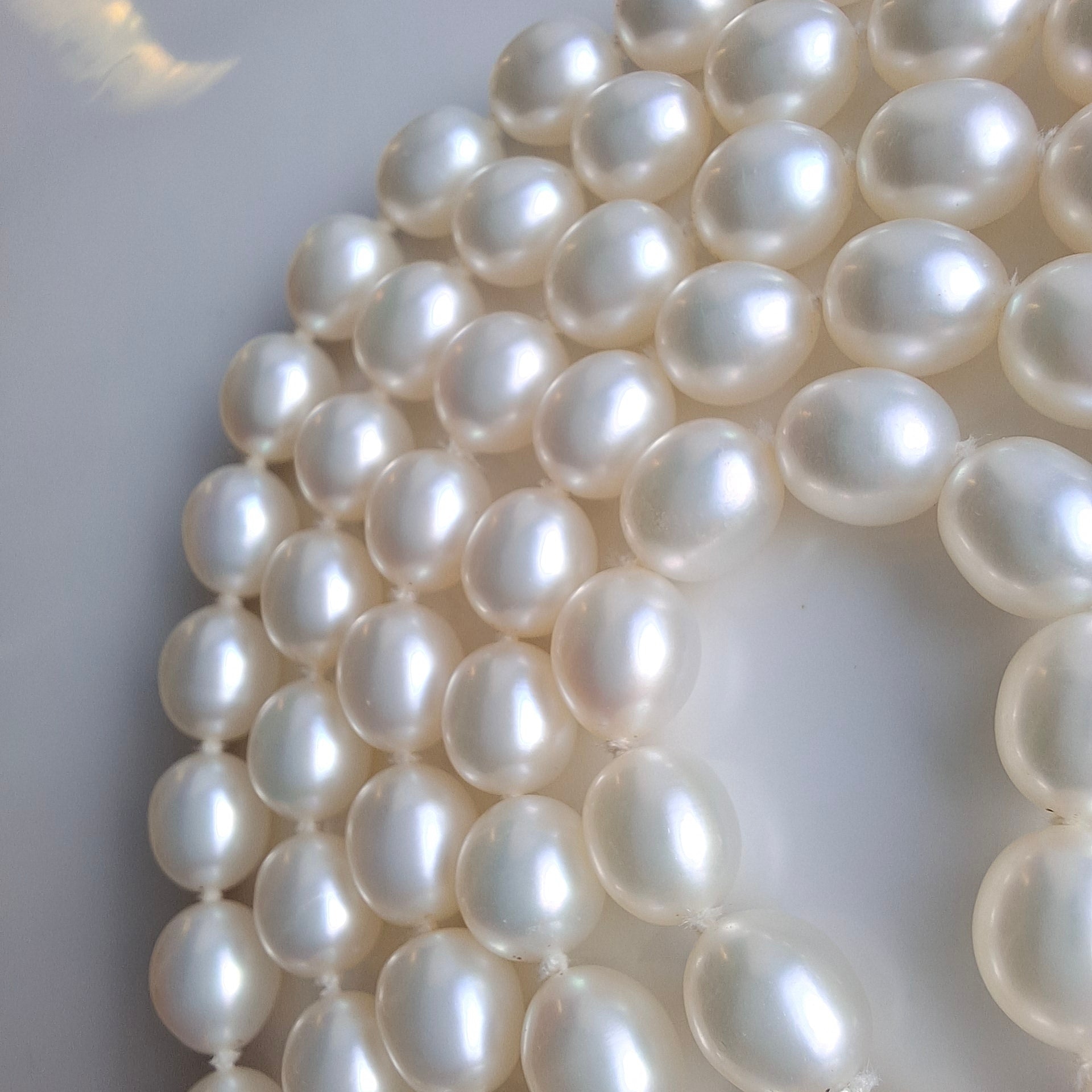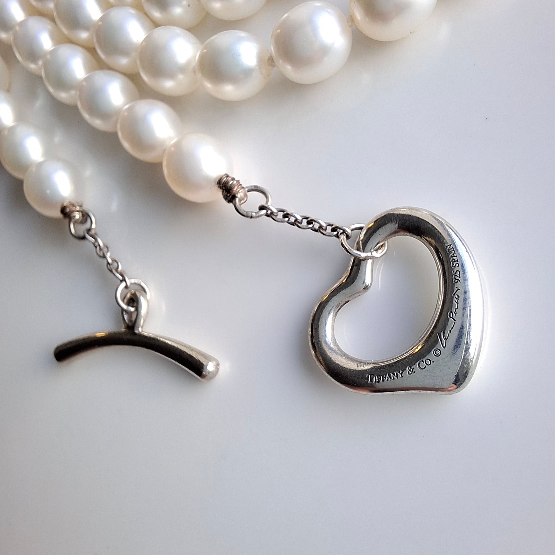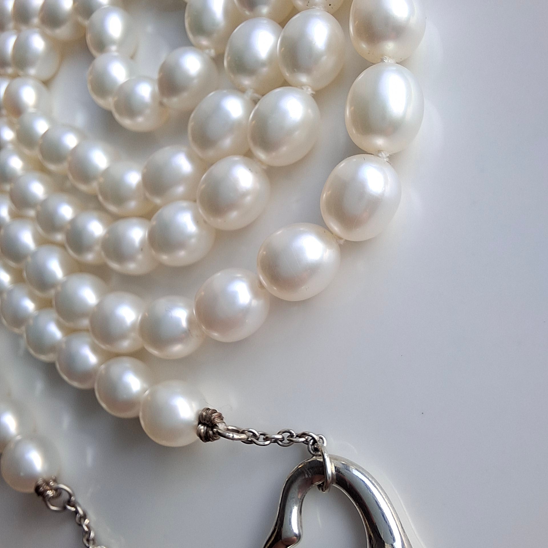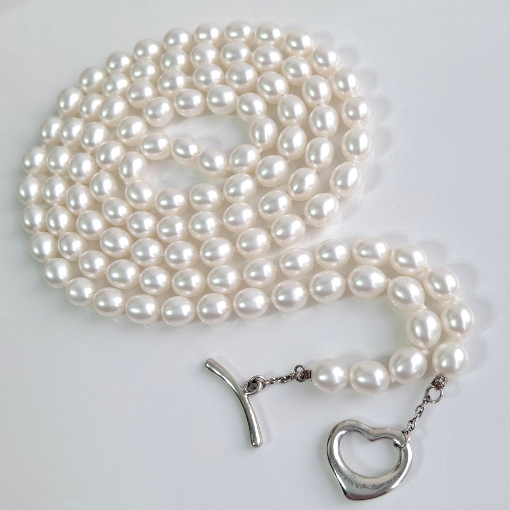 Long cultured freshwater pearl necklace by Elsa Peretti for Tiffany and Co. With solid 925 sterling silver open heart toggle fastening bearing the copyright Elsa Peretti signature. Measures 94cm long. Can be worn long or doubled as a collar necklace. With black suede Tiffany & Co. pouch.