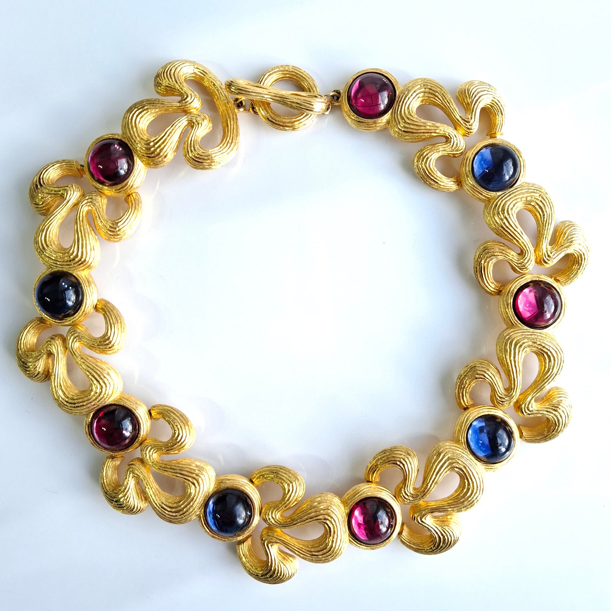 Stunning vintage Givenchy Necklace in Gold plated metal with coloured glass cobochon. In excellent condition, stamped Givenchy Paris to the clasp and main Necklace. 38cm in length and 3.5cm width.