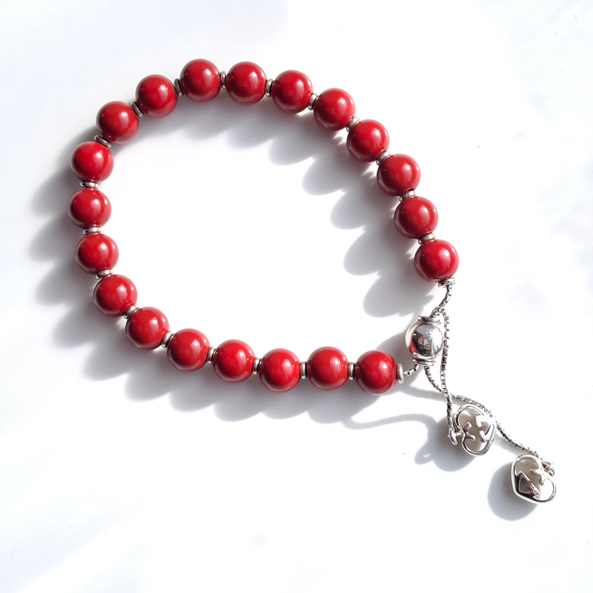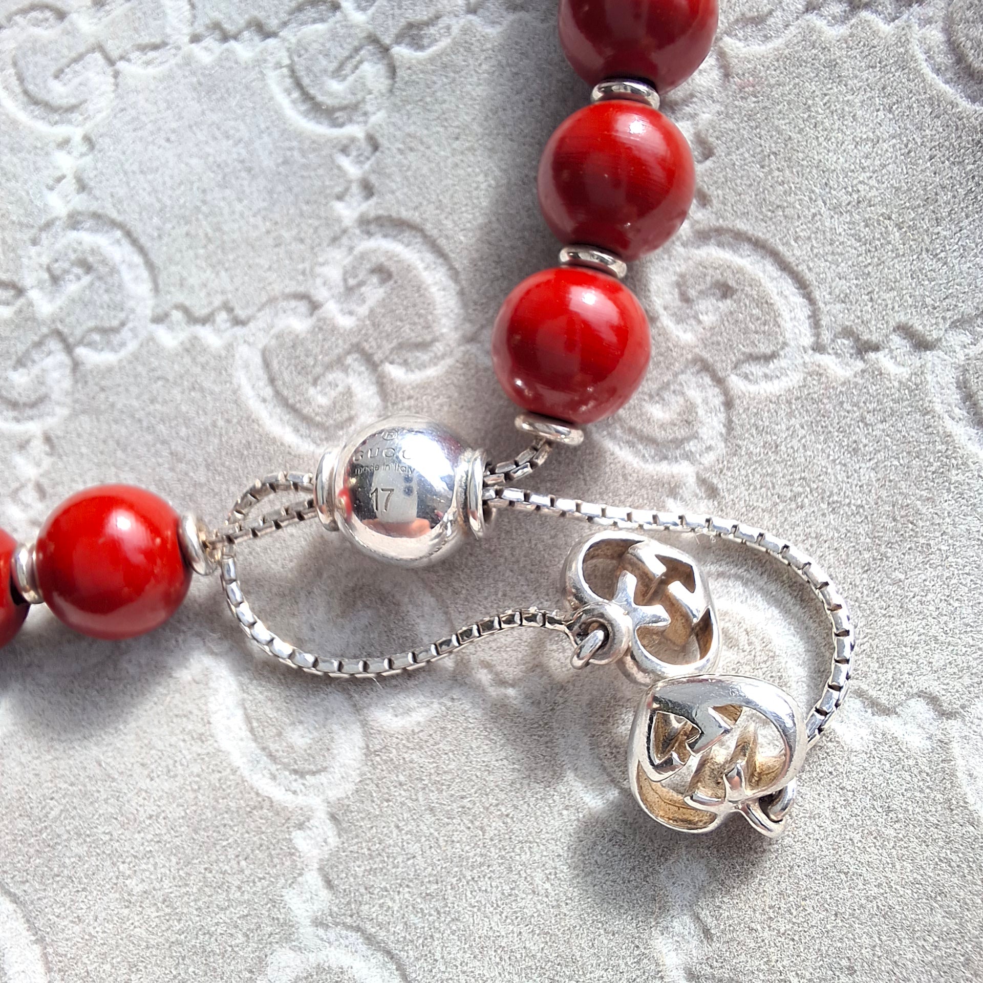Gucci red bead San Valentino bracelet. Adjustable silver chain, stamped GUCCI ITALY 17. With original pouch.