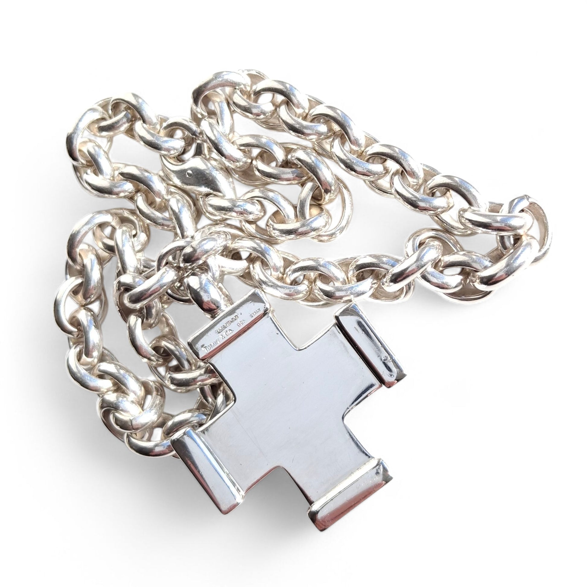 Rare vintage Tiffany & Co. Italian silver cross pendant necklace. Superb quality weighing 111 grams. Fully hallmarked. The chain measures 42cm and the cross 3.5cm square.
