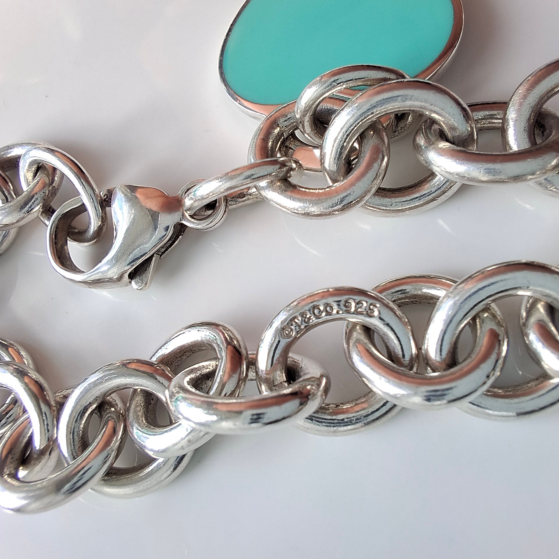 Rare Tiffany & Co. solid sterling silver heart charm bracelet. One side enamelled in Tiffany blue, the other stamped with the Please Return to Tiffany logo. Excellent condition with original pouch and box. With Tiffany & Co full silver hallmarks to the top of the heart tag. The bracelet is also stamped T& Co. 925. 18.5cm in length.