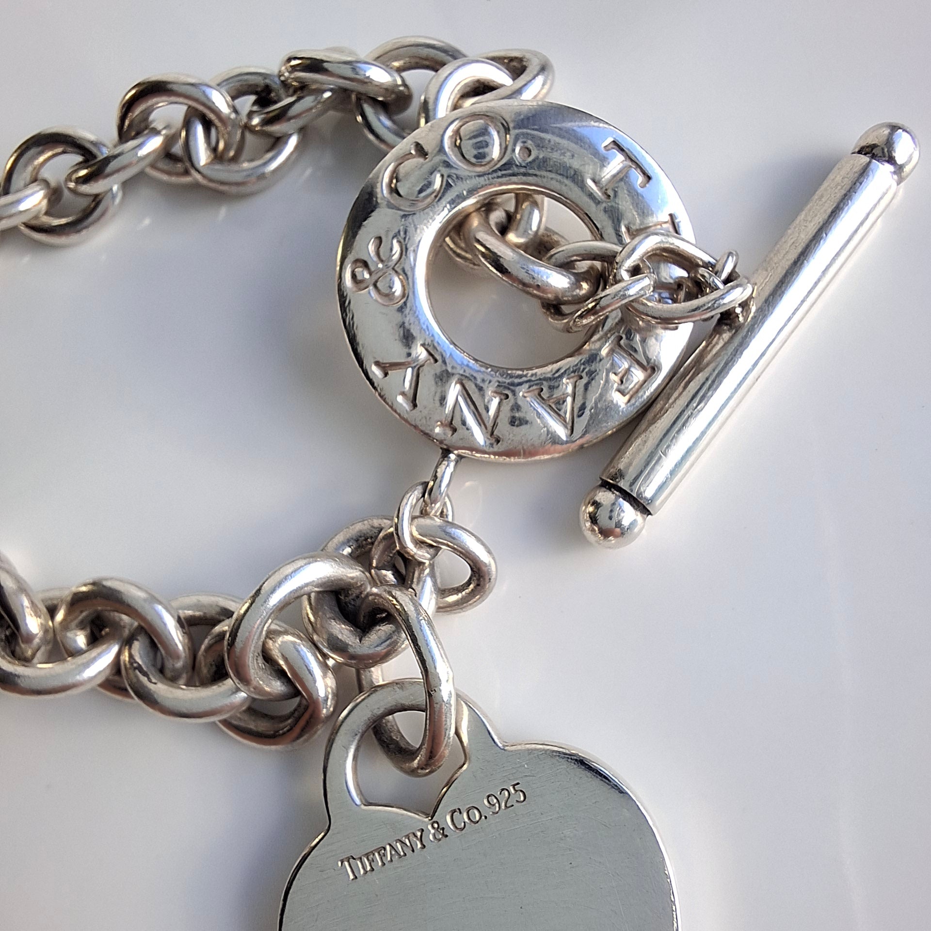 Original sterling silver Tiffany & Co. toggle bracelet with heart charm. Purchased from Tiffany & Co. Paris with original care card, box and pouch. Stamped Tiffany & Co. 925 to heart charm with T& C stamped to link on bracelet. 20cm in length.
