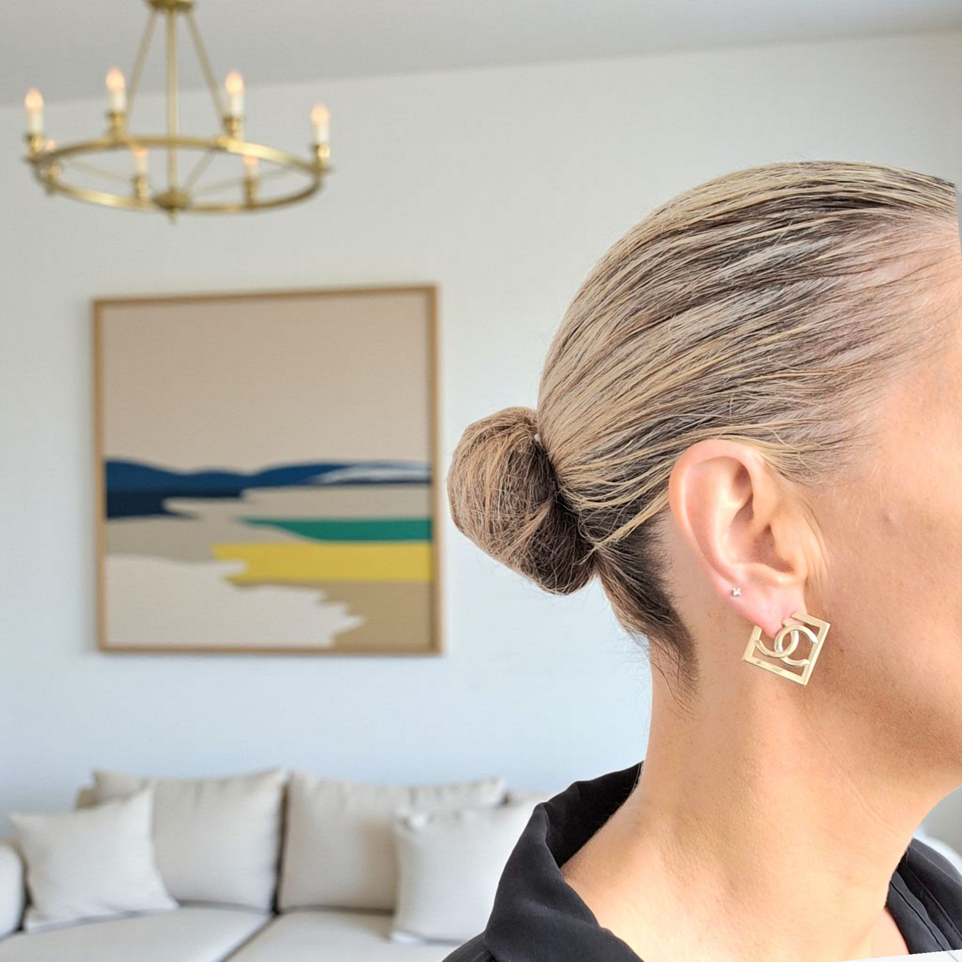 Chanel Gold Plated square CC logo earrings for pierced ears. Each bear the Chanel plaque stamped CHANEL A23 B MADE IN FRANCE. 2.3cm square.