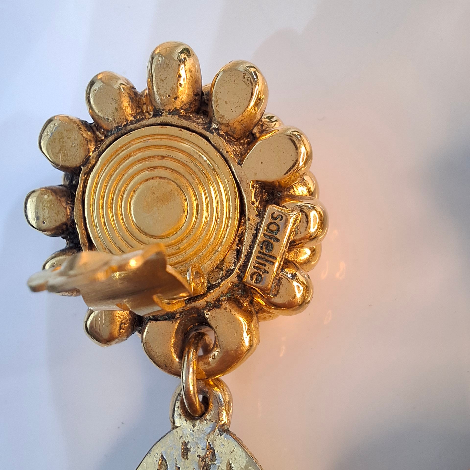 Large vintage statement earrings by Satellite of Paris. With handmade cabochon green glass inserts with molded patinated gold plated textured sputnik design frames. 6.5cm x 3cm.