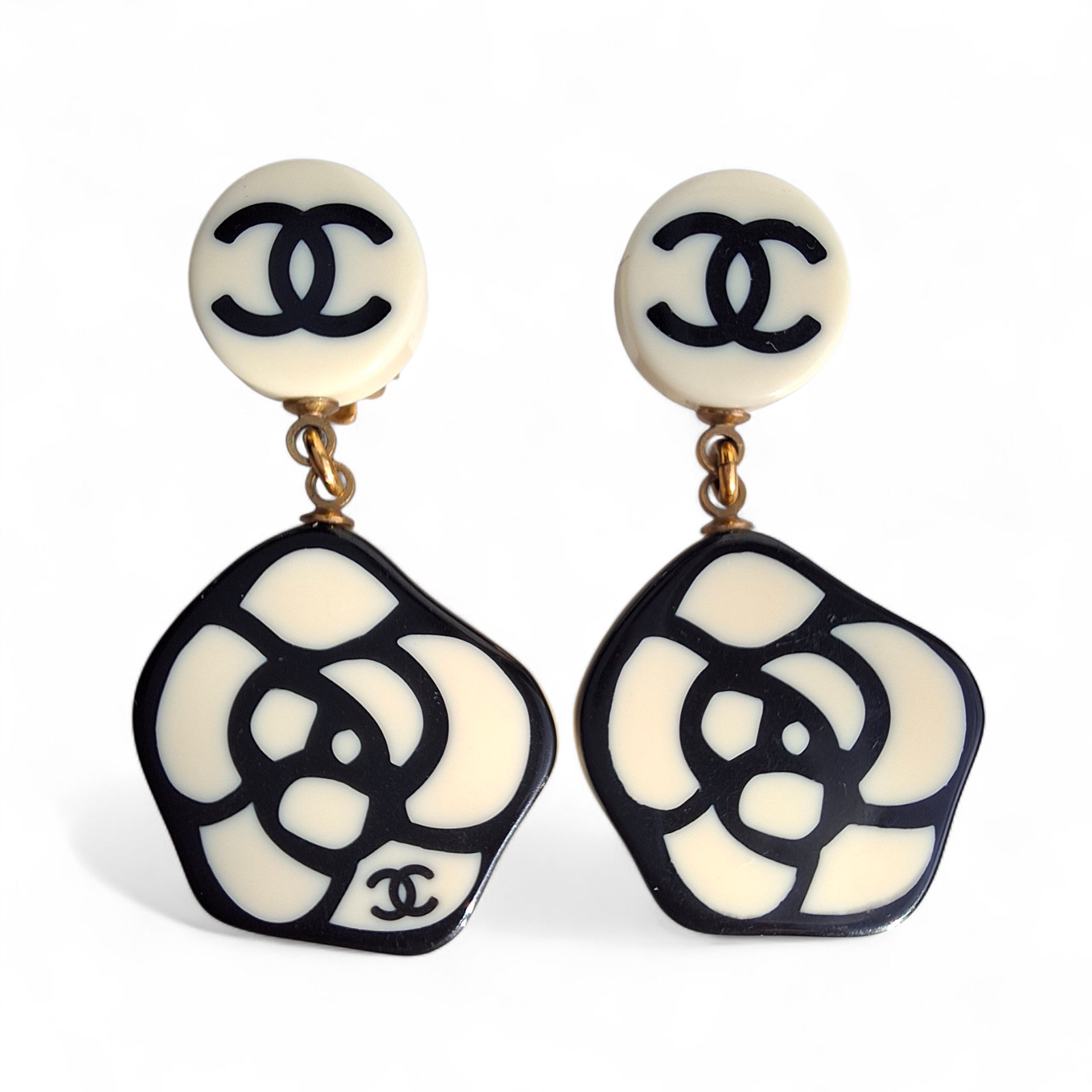 Vintage 2003 Camelia earrings by Chanel. Rare design in white resin with black CC logo detail. Both with Chanel plaques behind the clip-on fittings. 4.5cm long x 2.2cm wide.
