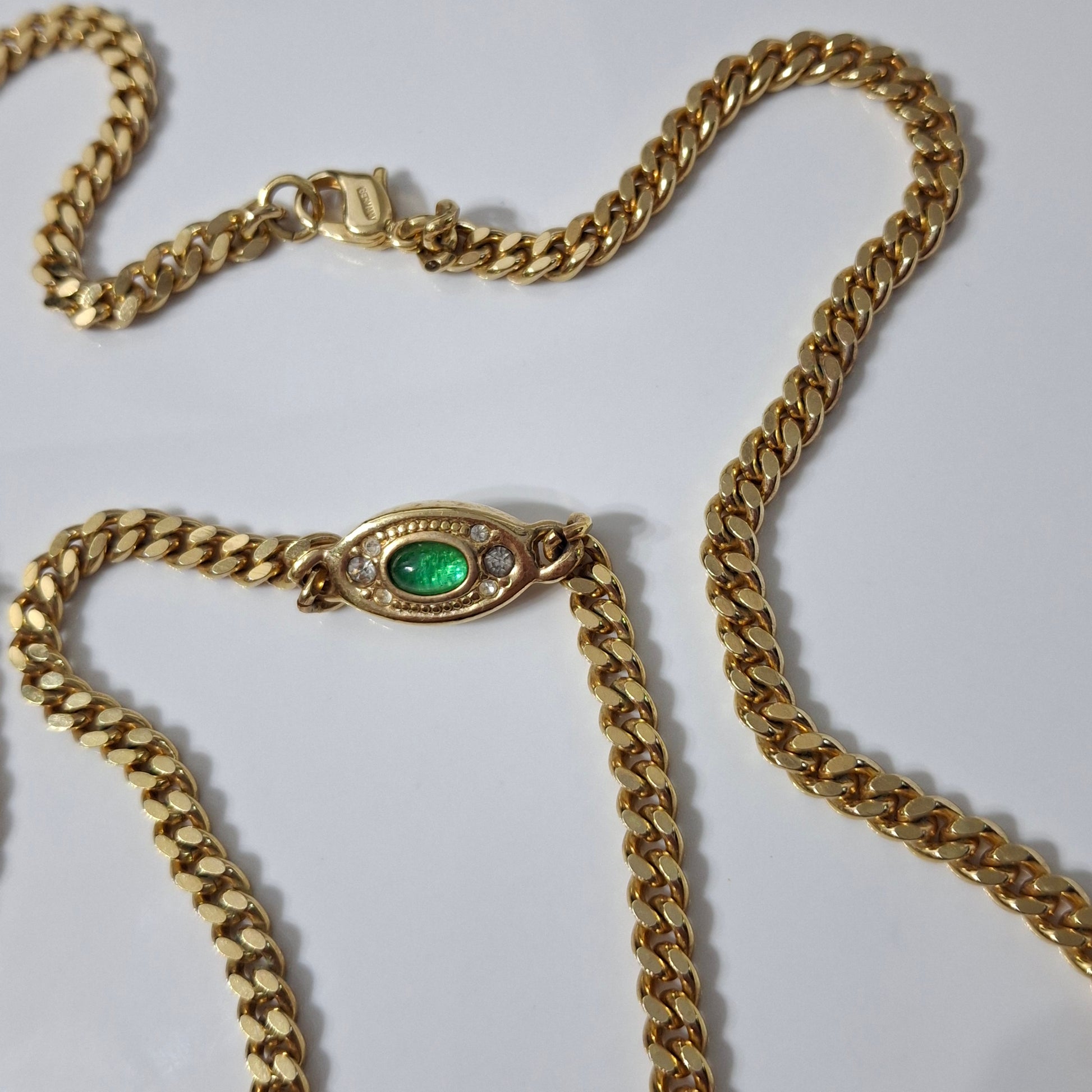 Vintage Cristian Dior Gold Plated Long Curb Link Necklace with Emerald Green Glass Cobochon