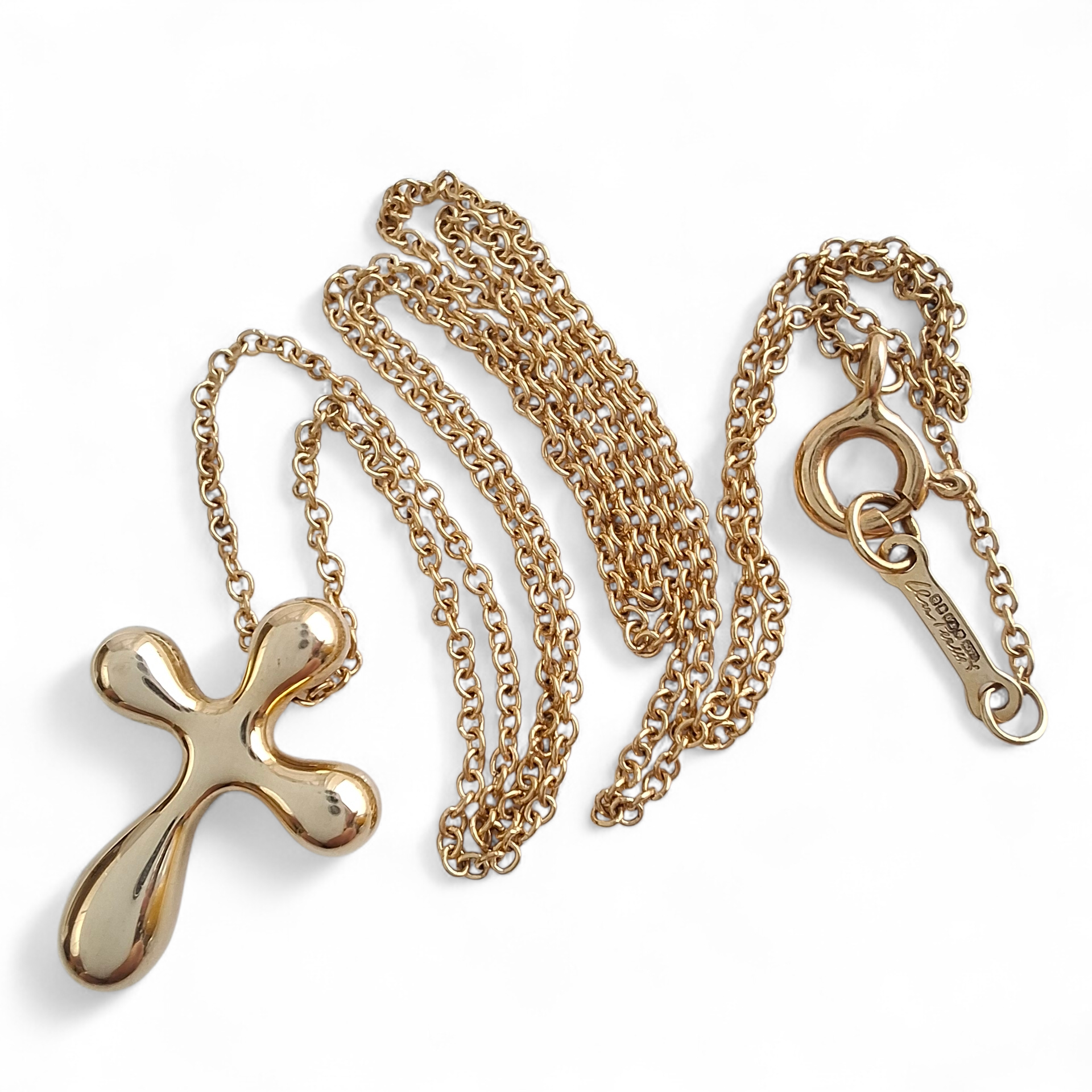 Elsa Peretti cross pendant necklace in solid 18k gold. With hallmarks for 2004. Signed Elsa Peretti and stamped Tiffany& Co 750. Original box. The cross measures 1.2cm x 1.6cm and the chain is 16 inches / 41cm. Weighs 3.85 grams.