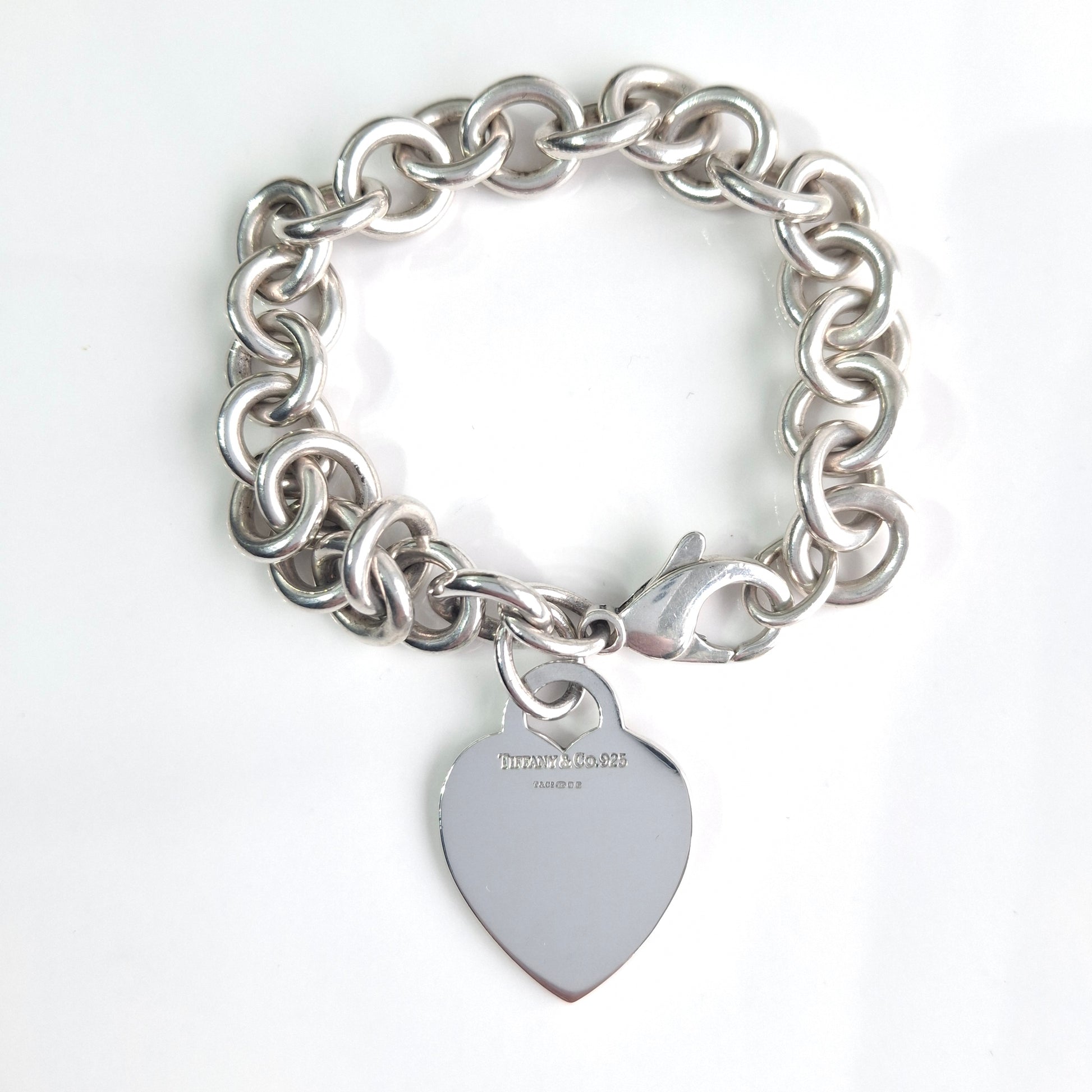 Vintage solid silver bracelet by Tiffany and Co. The heart charm is inscribed TIFFANY & Co. 925 with Tiffany and Co. UK hallmarks for 925 sterling silver. Measures 19cm in length and the heart charm is 2.1cm x 2.7cm.