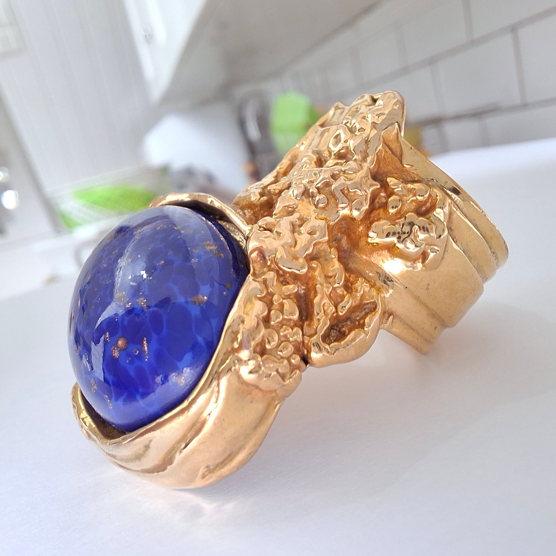 Circa 1980s statement ring by Yves Saint Laurent. Gold plated with faux lapis cabochon in deep blue with gold sparkles. In excellent condition. US ring size 8, UK size P.
