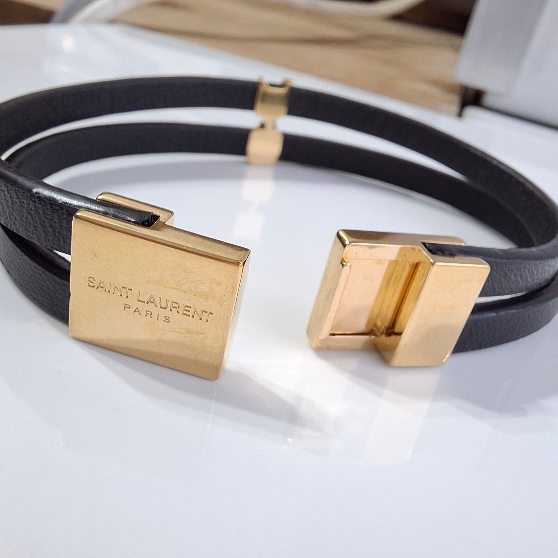 Double strand black leather bracelet by Yves Saint Larent with YSL logo. 20 cm long x 1.5 cm max.
